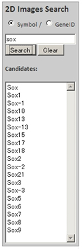 To retrieve gene expression patterns, searches can be initiated by entering the information in the search box located either in the main page or in the search page (click "Start EMBRYS"). Queries can be made using either gene symbol or NCBI Gene ID (check either one you desire).