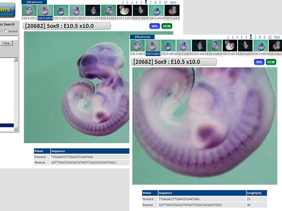 To see the images, click the gene symbol of your interest, and all the images available are displayed as small thumbnails at the top and the primer information is displayed at the bottom. Click the thumbnails you want to observe more carefully, and then the enlarged image is shown in the main screen.